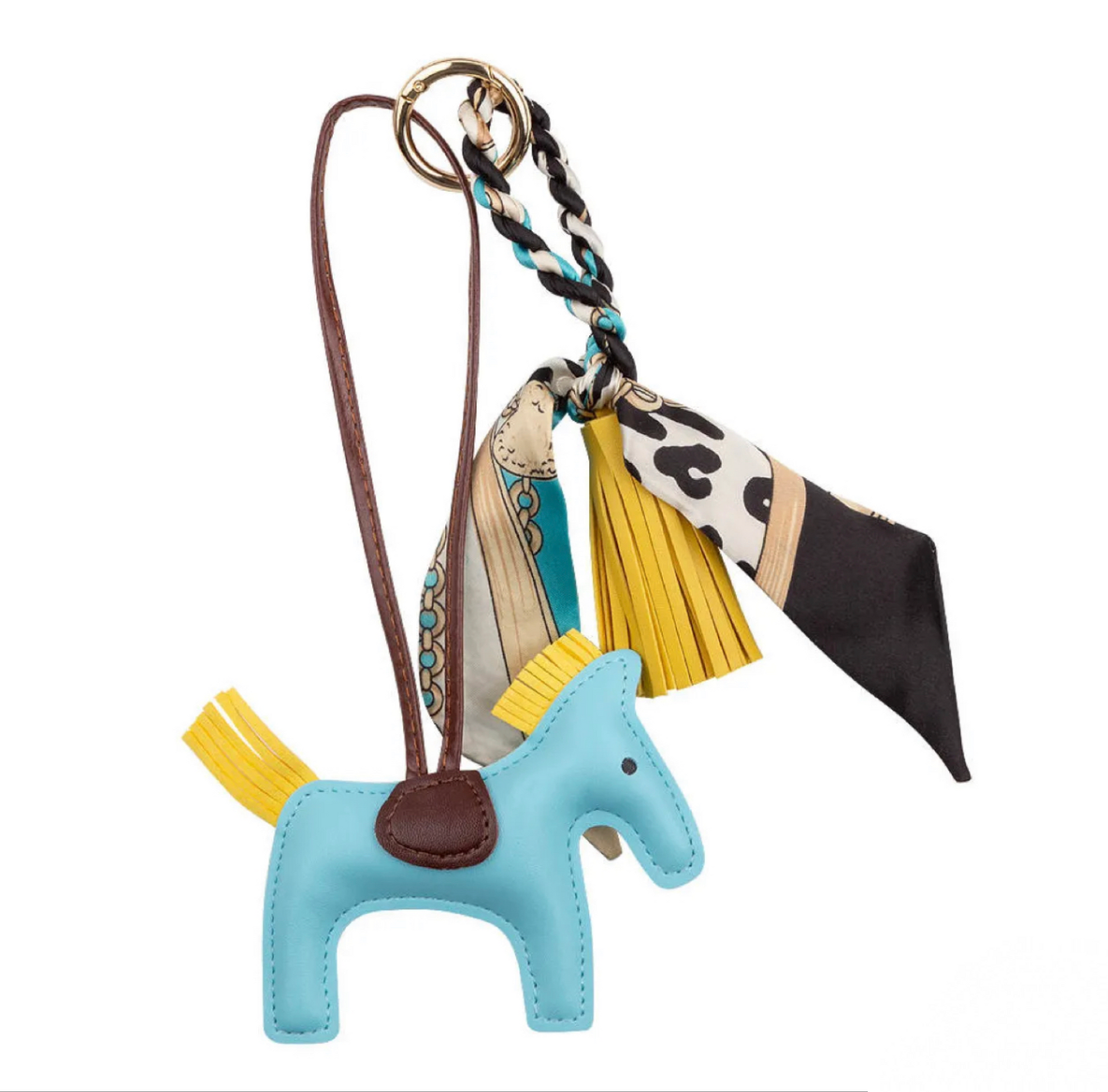 Sweet little padded pony key ring with a faux leather tassel and equestrian themed satin scarf.