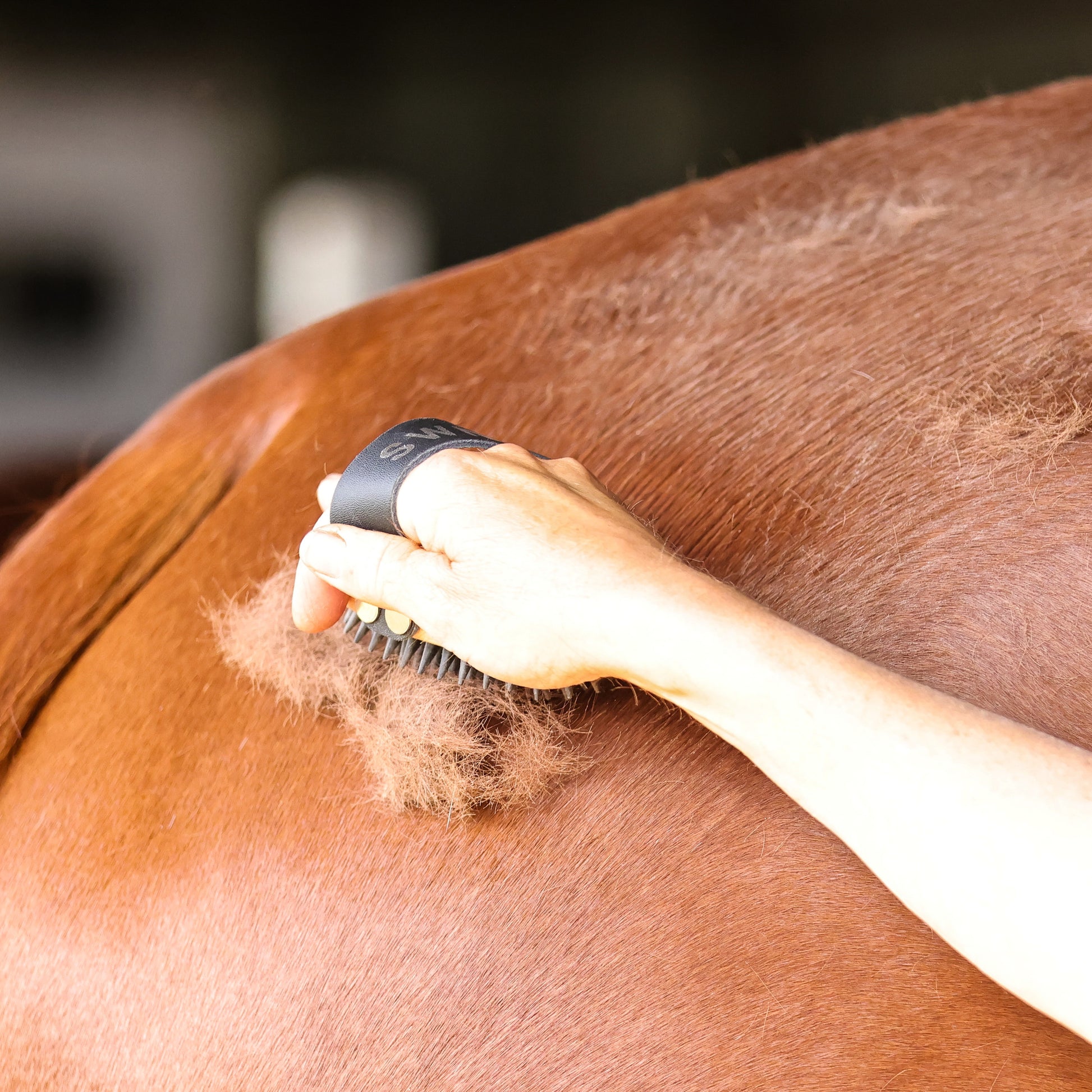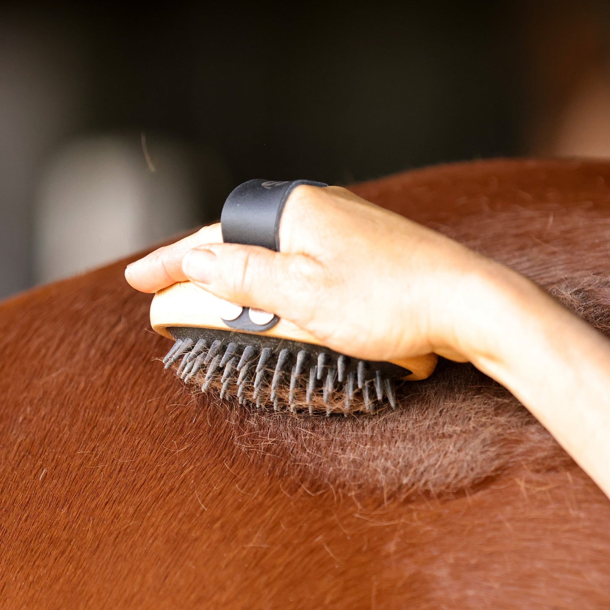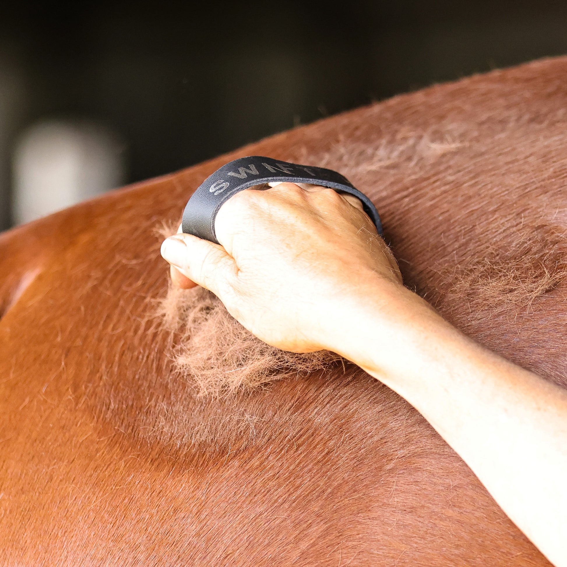 The Swift Curry Comb gently removes loose coat and skin when used in a circular motion. It size makes it easy to grip with your hand and maneuver. Made with a genuine leather strap, strong rubber micro teeth and in an ergonomic shape that makes it easy to hold and maneuver.
